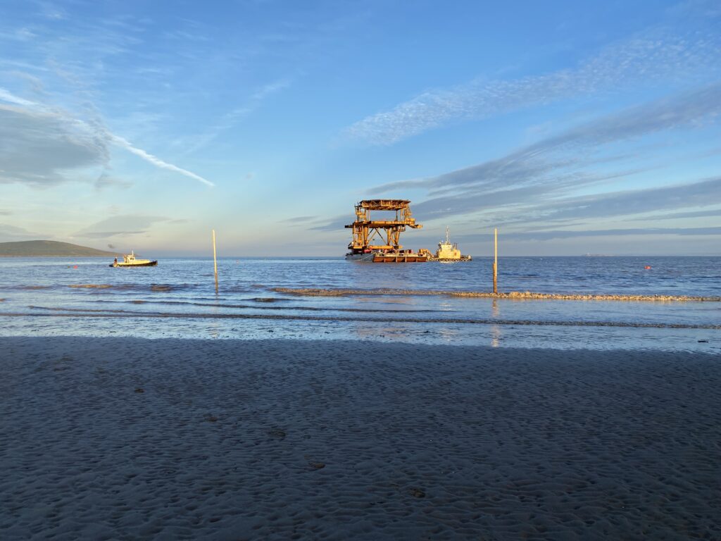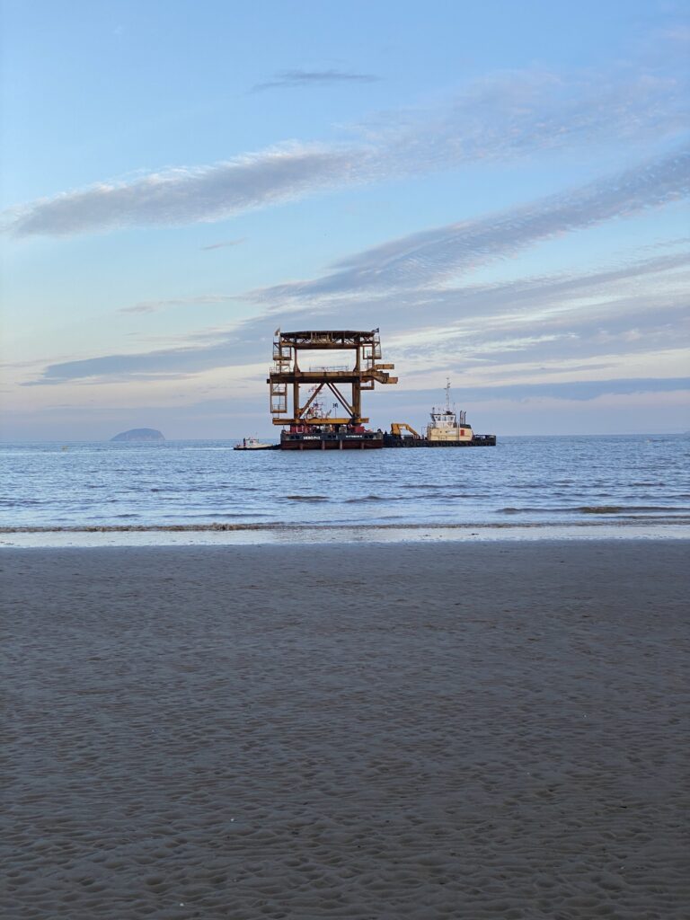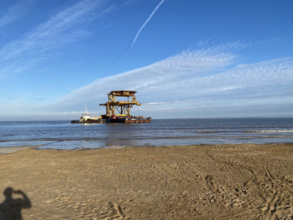 The SEE MONSTER topside weighs 450 tonnes and was lifted off an SPMT in the bay of Weston-super-Mare, where it has recently been transported from the Netherlands, for final drop-off at its site of installation in the Tropicana.