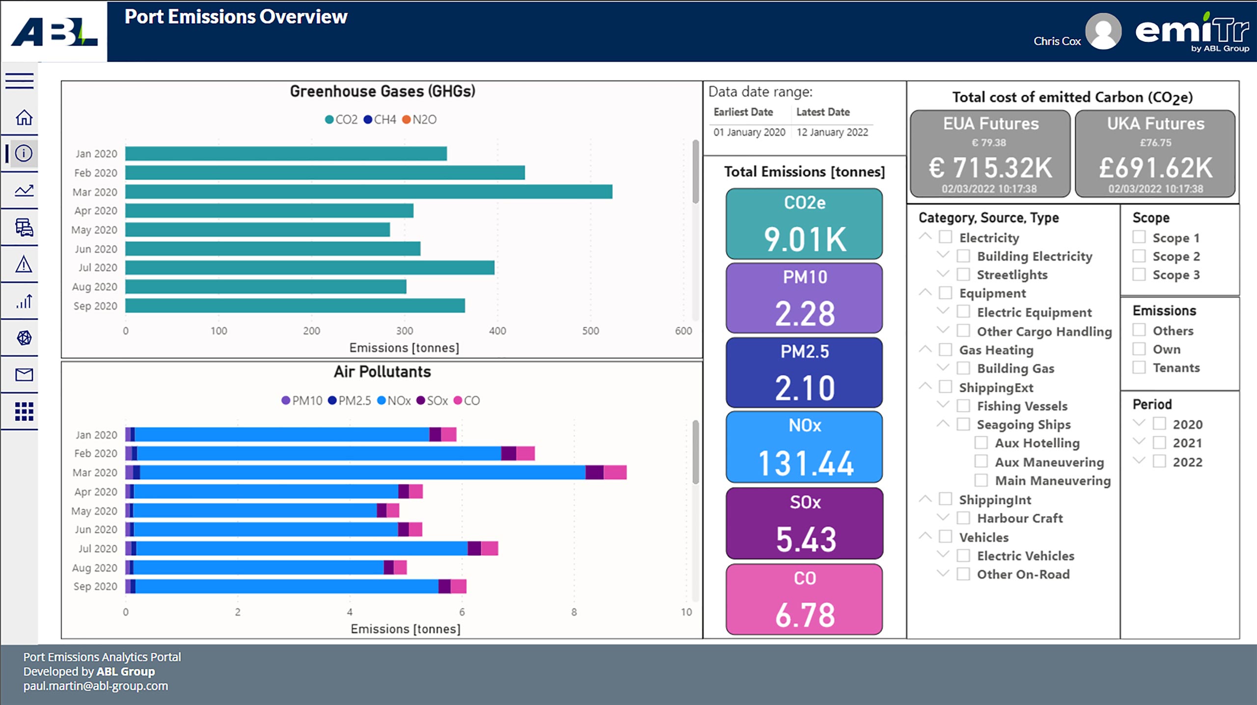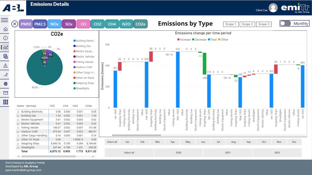 Based on the “Port Emissions Toolkit”, emiTr enables our clients to visualise and understand their emissions footprint via a series of configurable graphics, calculating the potential carbon cost in monetary terms, and identifying the biggest emitters, thereby informing action in line with national and international reduction targets.